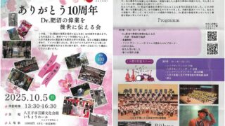 イベント Dr.肥沼の偉業を伝える会10周年、10/5に芸術文化会館いちょうホールで開催 2025年10月5日(日)に八王子市芸術文化会館いちょうホールで「ありがとう10周年 Dr.肥沼の偉業を後世に伝える会」が開催されます。八王子出身の医師、肥沼信次博士の功績を伝える会の設立10周年を記念するものです。式典のほか、地域の団体に... 2025.09.25 イベント