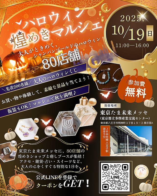 2025年10月19日(日)に八王子市の東京たま未来メッセにて「ハロウィン煌めきマルシェ」が開催されます。